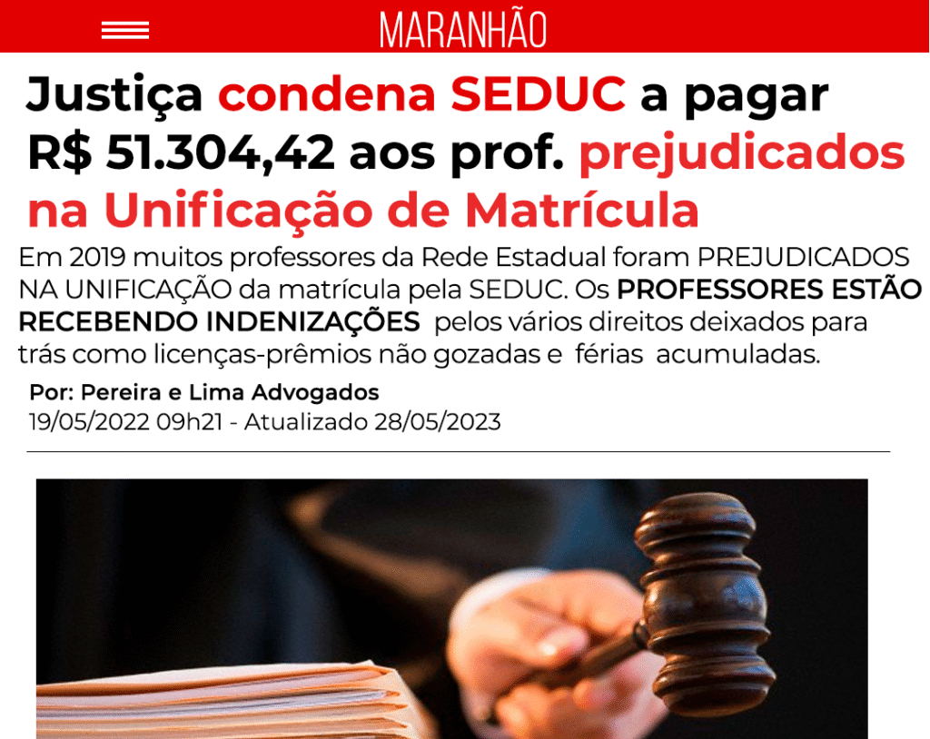 Em decisão judicial, a SEDUC, na pessoa do Estado do Maranhão, é condenada a indenizar professor por Unificação de Matrículas ocorrida em 2019/2020. Sabe-se que a unificação de matrículas foi uma manobra do governo e gerou danos irreparáveis aos professores, tais como, perda do tempo de serviço, titulação, entre outros direitos na matrícula mais antiga. […]